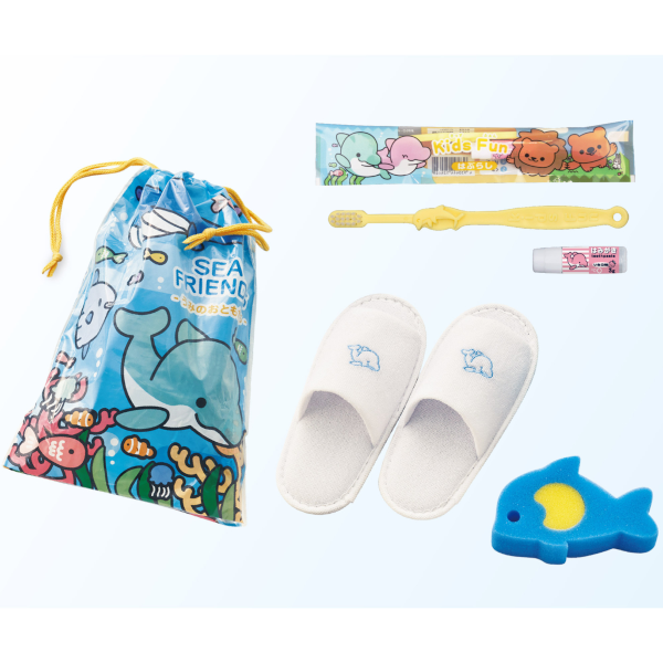 DIT145  | 子供用アメニティセット シーフレンズ 【120セット入り】(60セット×2袋) | 1ケースの価格¥35,772(税込) 1セットあたり271 歯磨き粉つき 子供用の歯ブラシセット、ボディスポンジ、子供用スリッパがセットになってきんちゃく袋に入っています。海がテーマなのでプールや海の近くの宿泊施設などに!  |